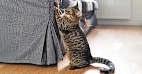 Cats don’t like to scratch slick surfaces, so cover furniture with a sheet and use double-sided tape to keep it in place. For carpet, you can cover the cat’s favorite scratching spots with a runner or simply move a piece of furniture to cover it.